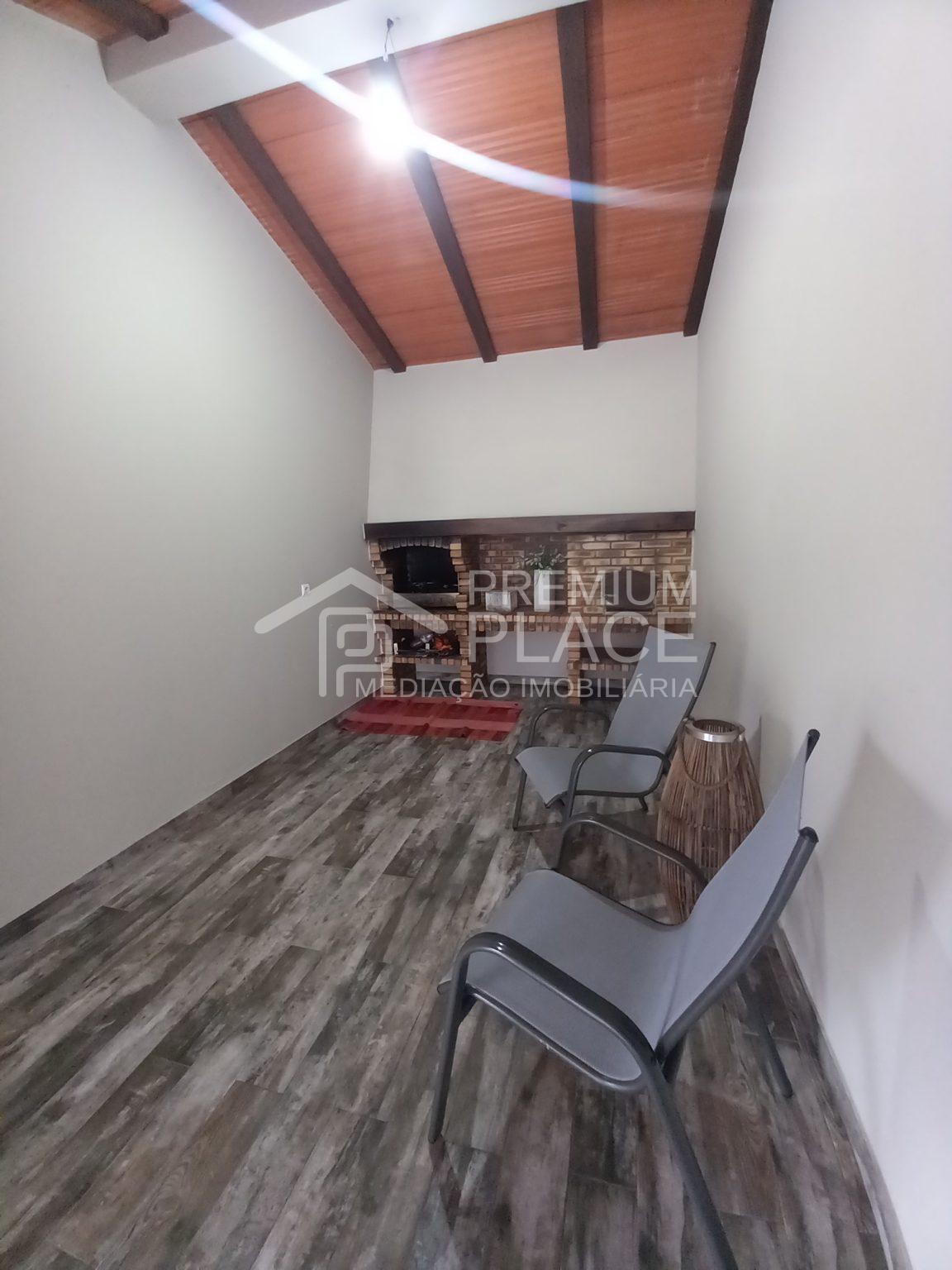 1 logradouro na porta principal; 1 hall de entrada espaçoso com acesso ao 1º andar, 1 sala espaçosa dividida em zona de refeição e zona social com salamandra;