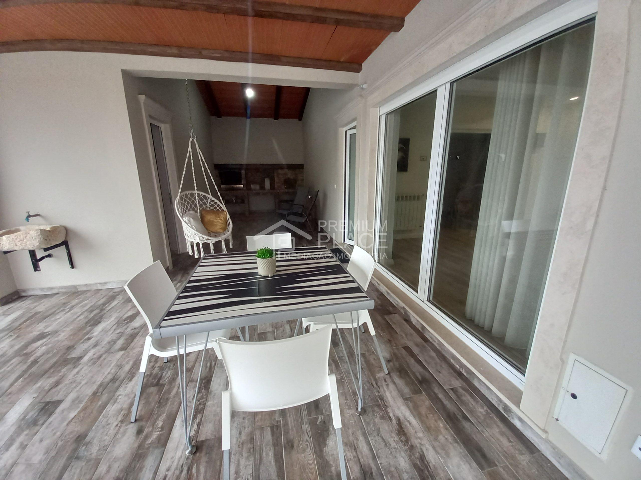 A moradia é composta por 2 pisos, esta é fechada em toda a sua volta, com muro e 2 portões, criando um lar acolhedor e dando uma maior privacidade, podemos contar com, 2 alpendres sendo 1 junto à porta principal e 1 nas traseiras da moradia, com uma cozinha de apoio á churrasqueira e á piscina.