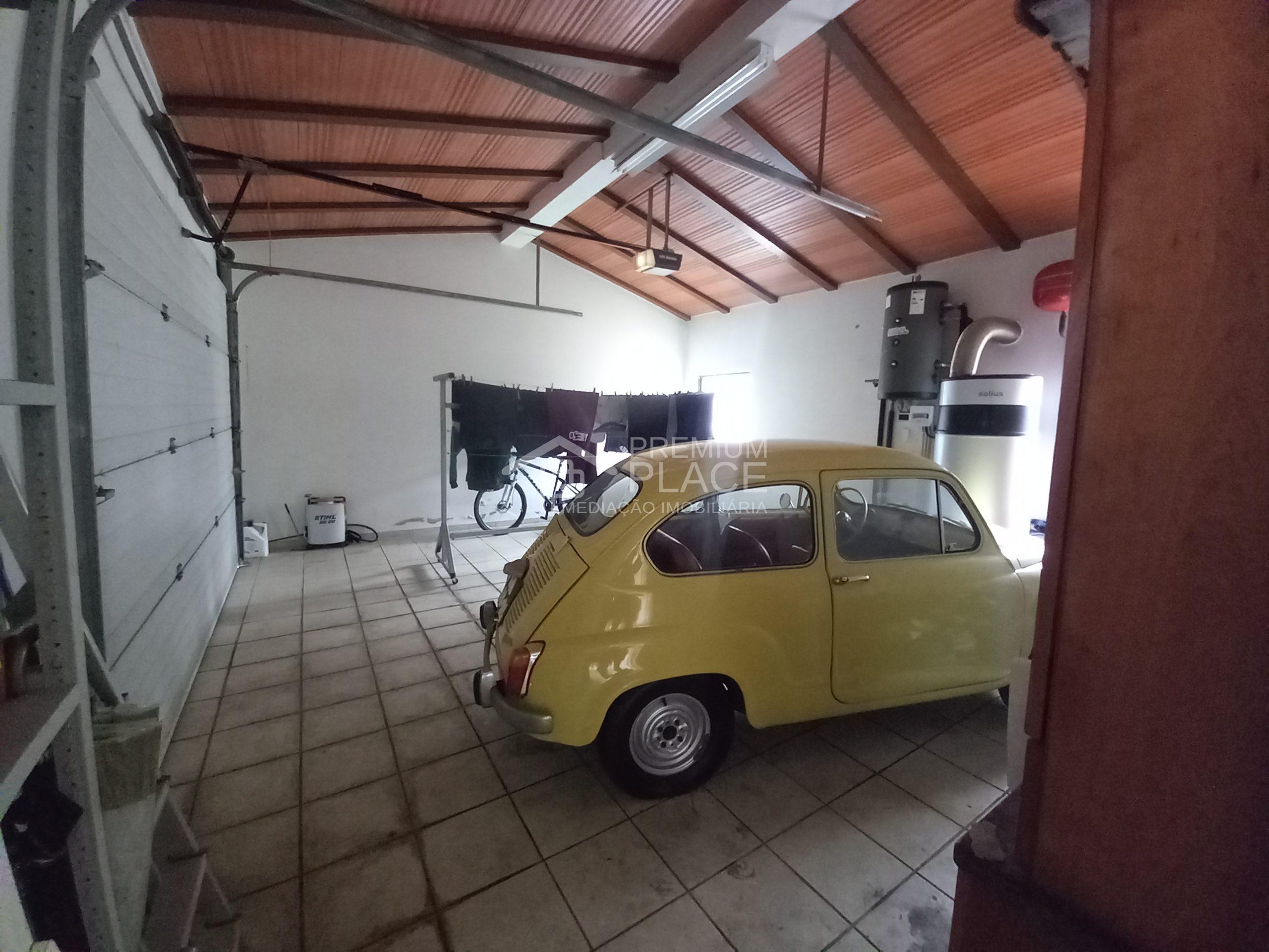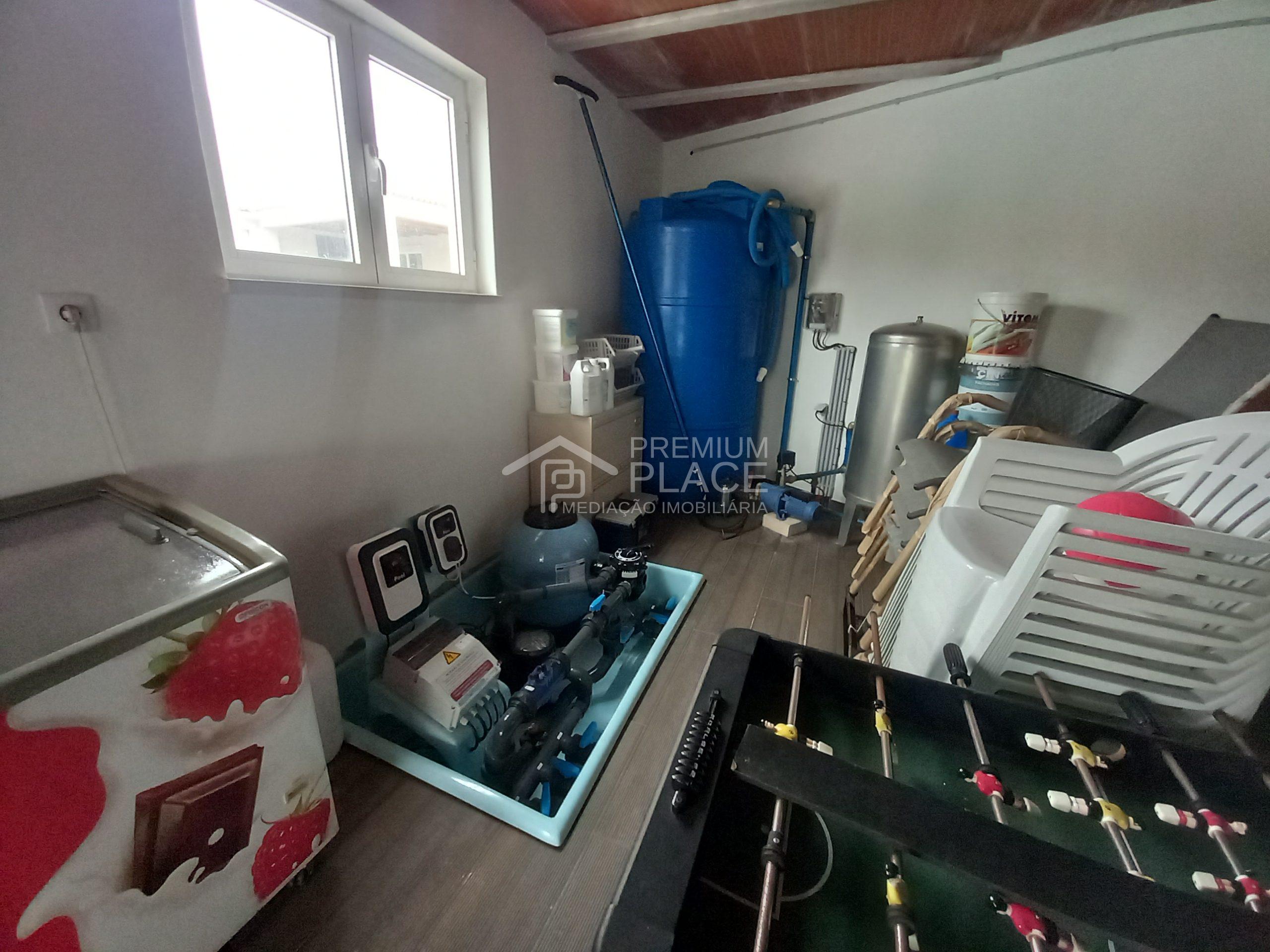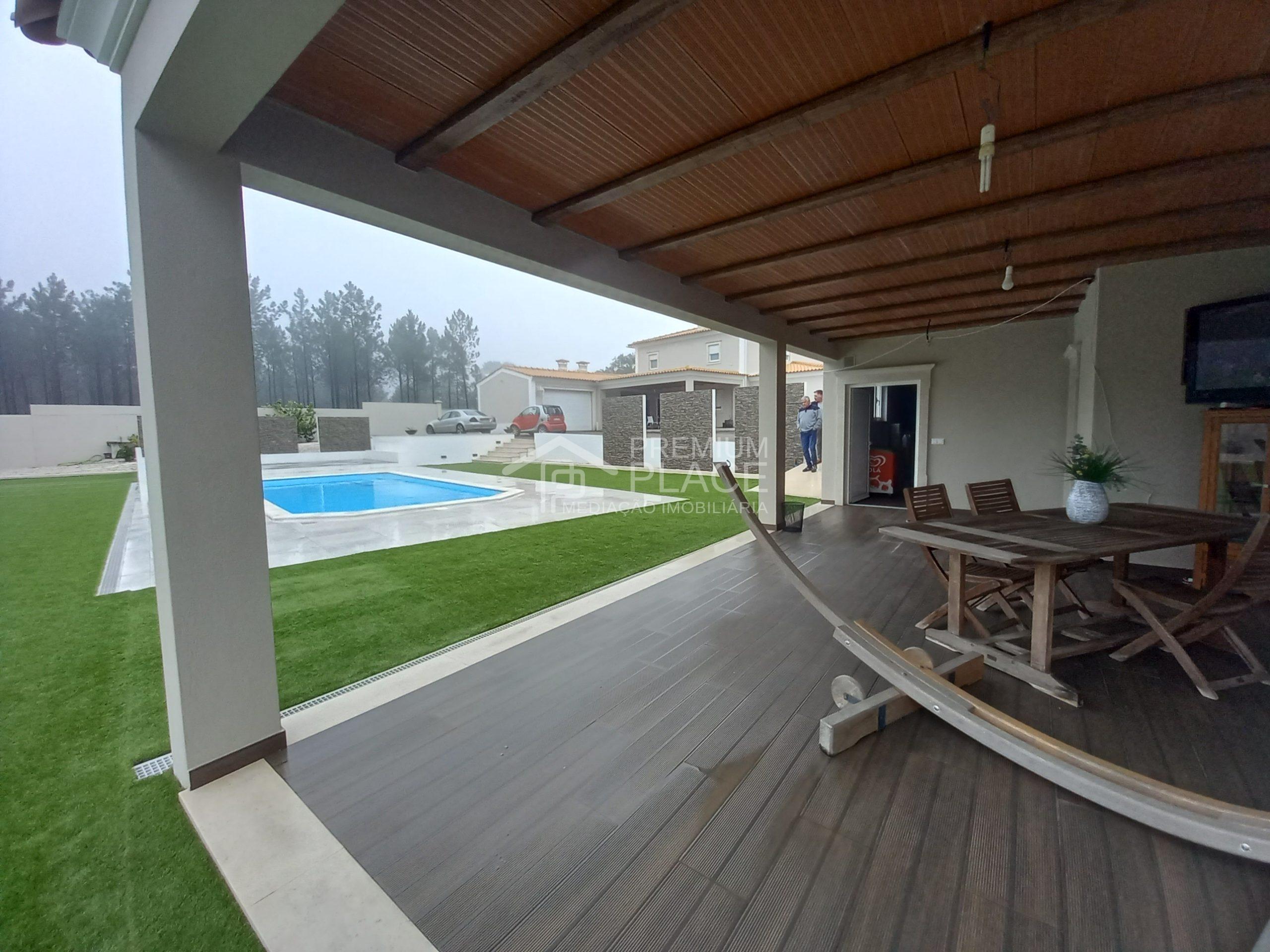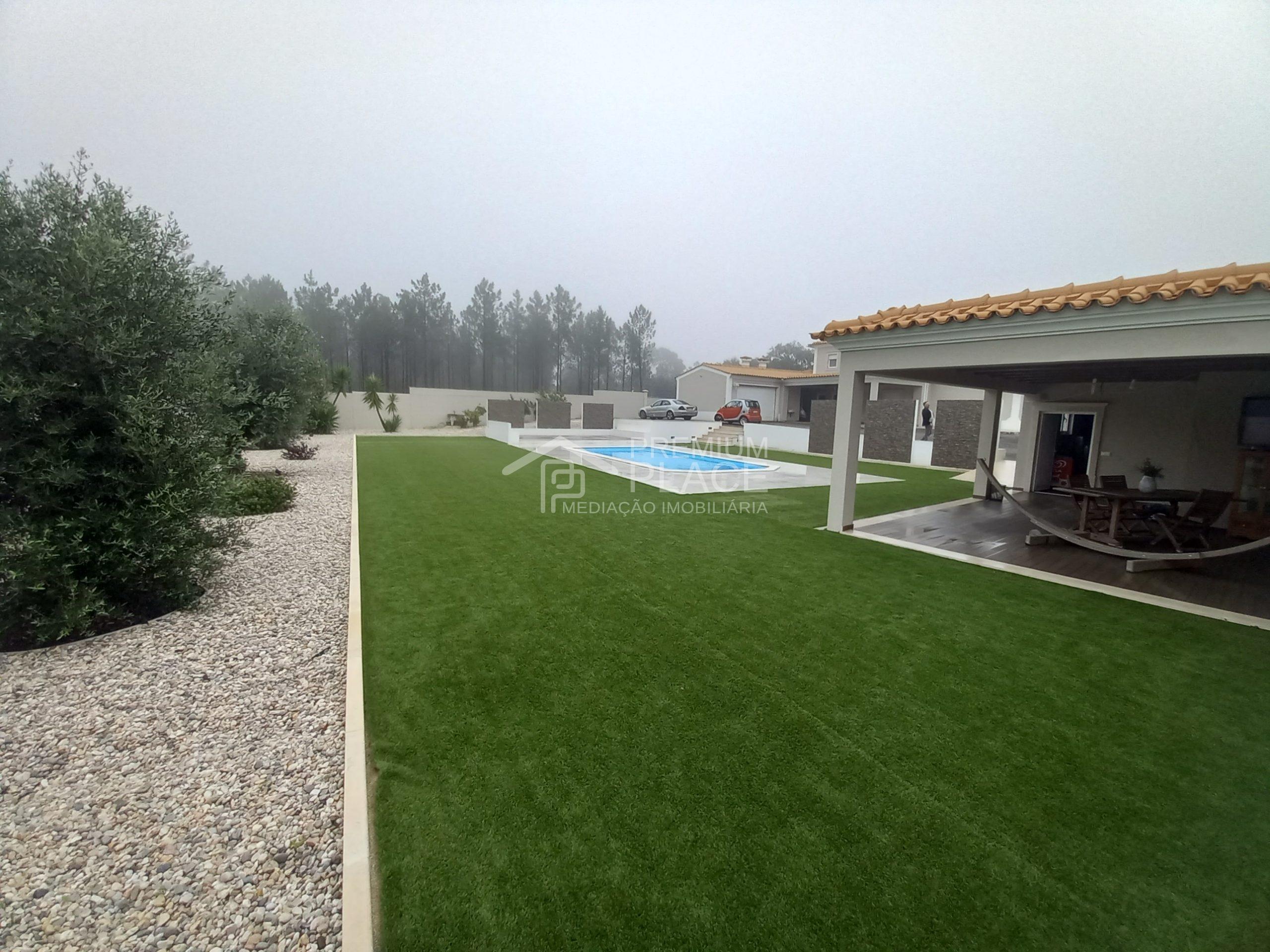 Nas traseiras do imóvel temos uma maravilhosa Piscina com Deck de apoio e 1 Sala de Arrumos, também temos o acesso a uma espaçosa Garagem. Podemos contar com jardim verde em toda a volta da moradia e um caminho em brita, que dá um requinte e faz contraste com a piscina e o relvado.