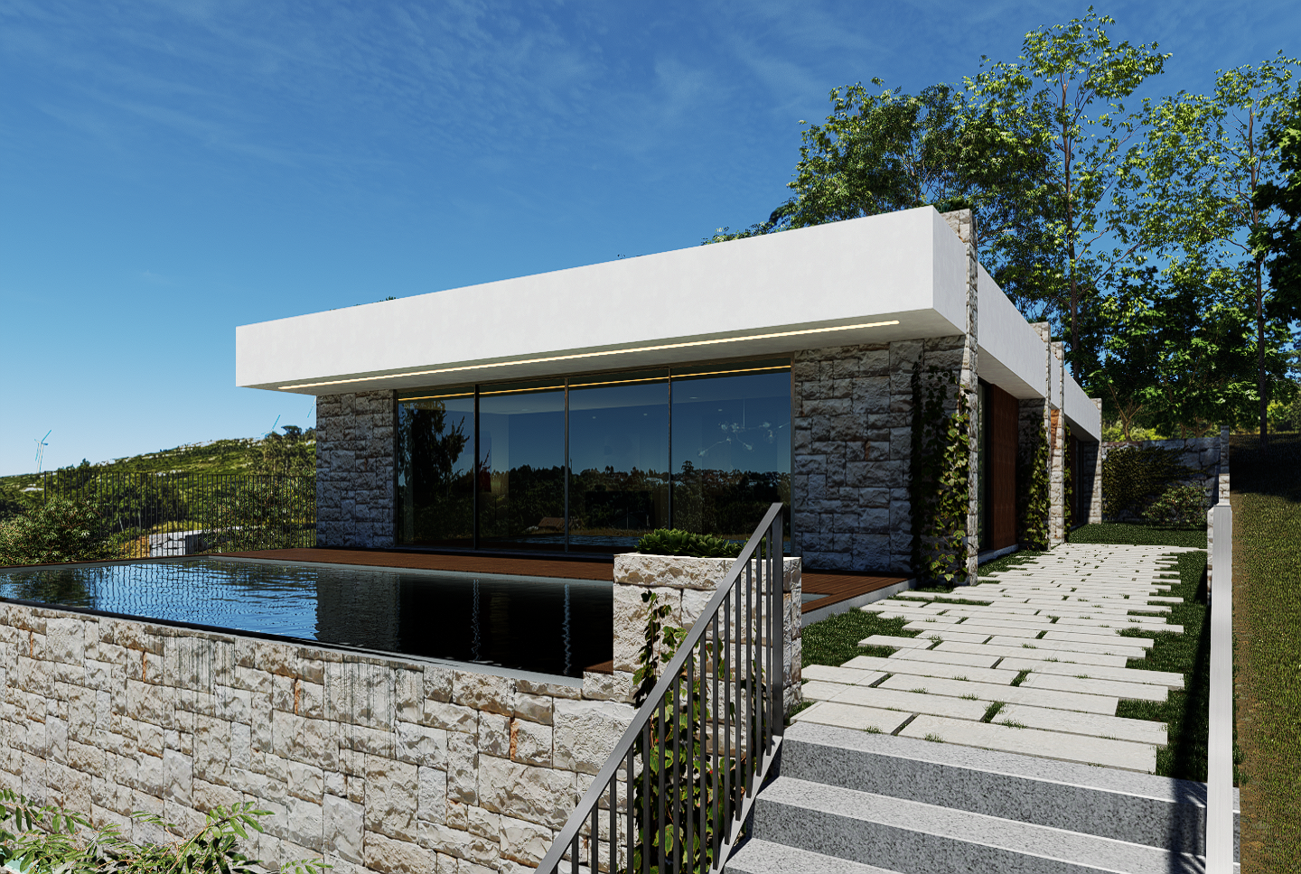 Descrição: Apresentamos este excelente terreno com projeto aprovado para moradia de 285 m², com piscina de vista infinita, inserido na paisagem única do Parque Natural da Serra de Aire e Candeeiros.